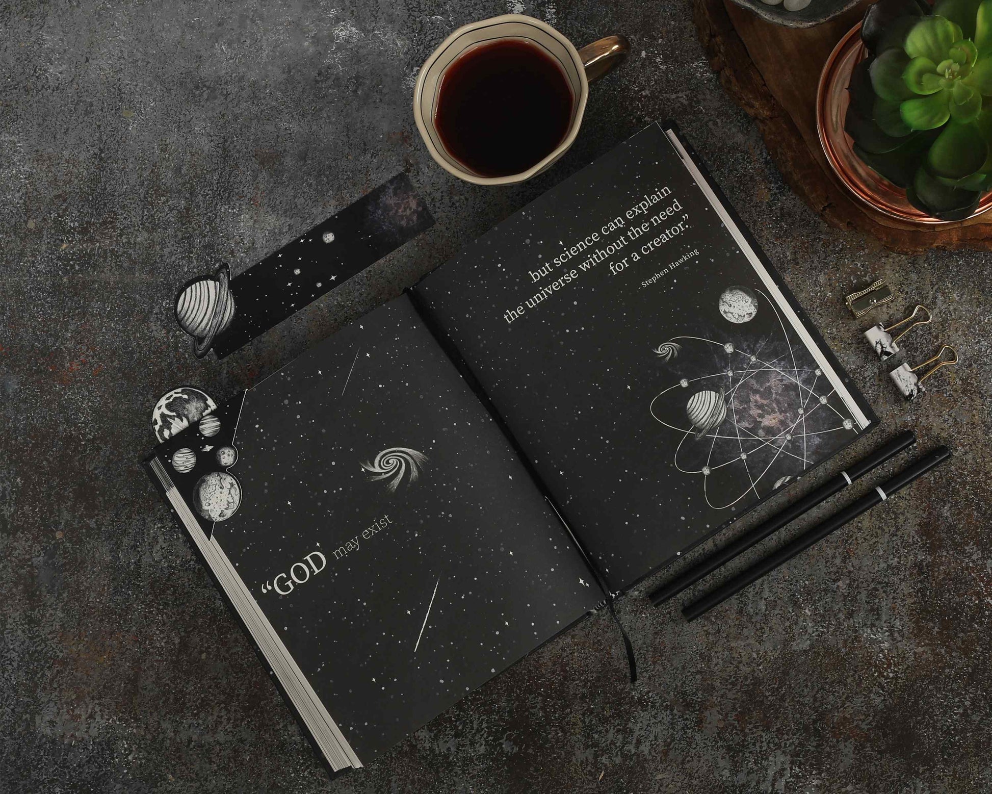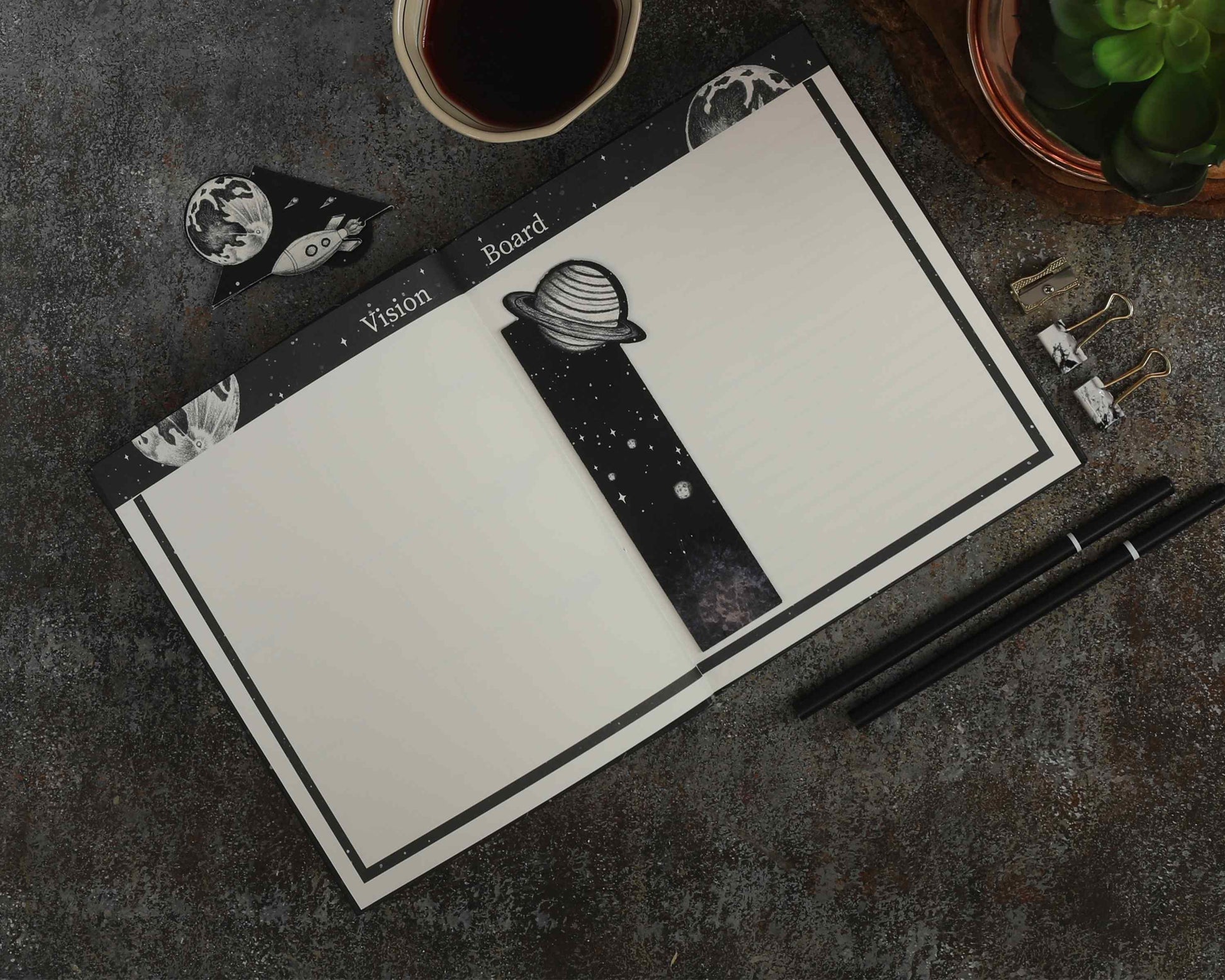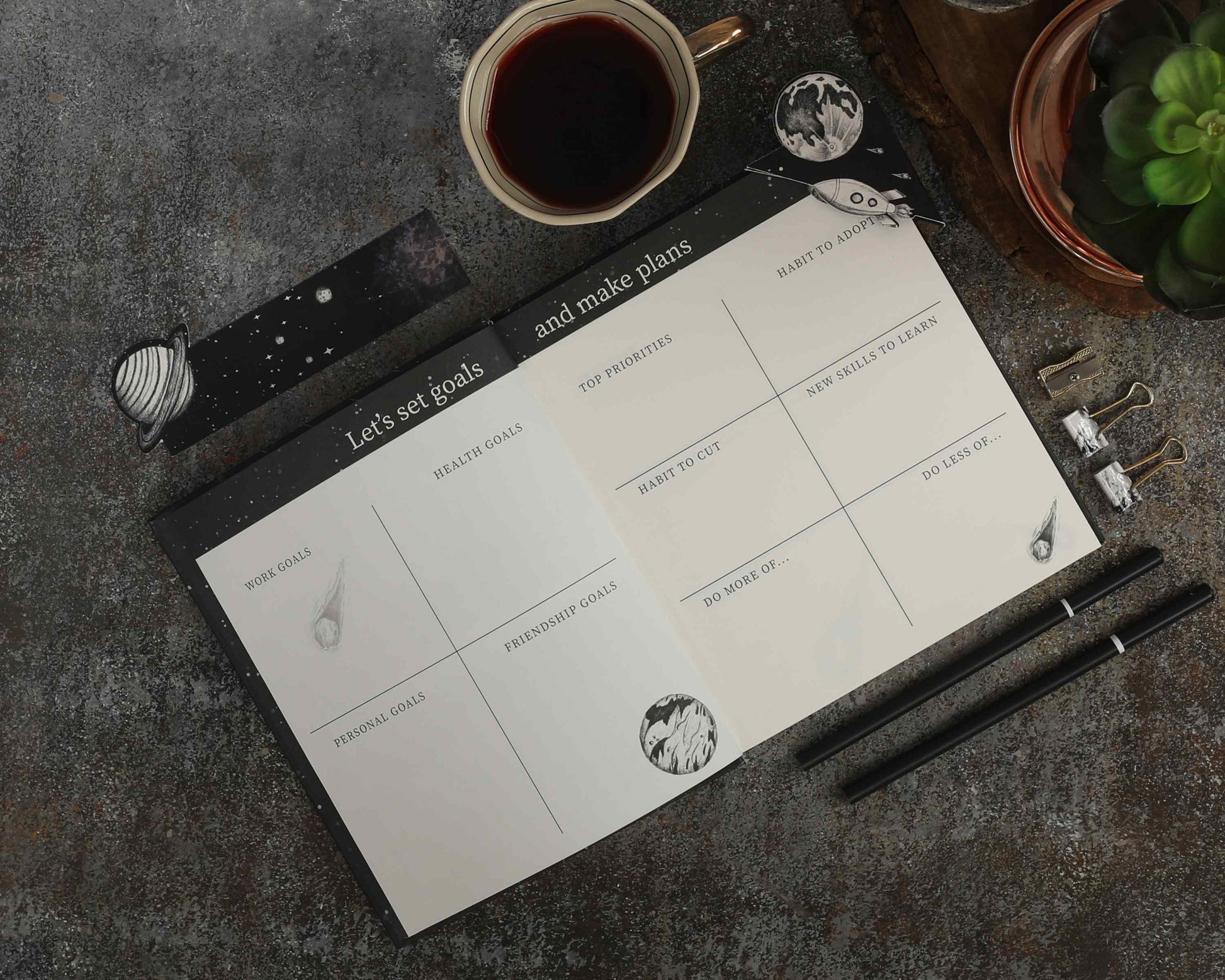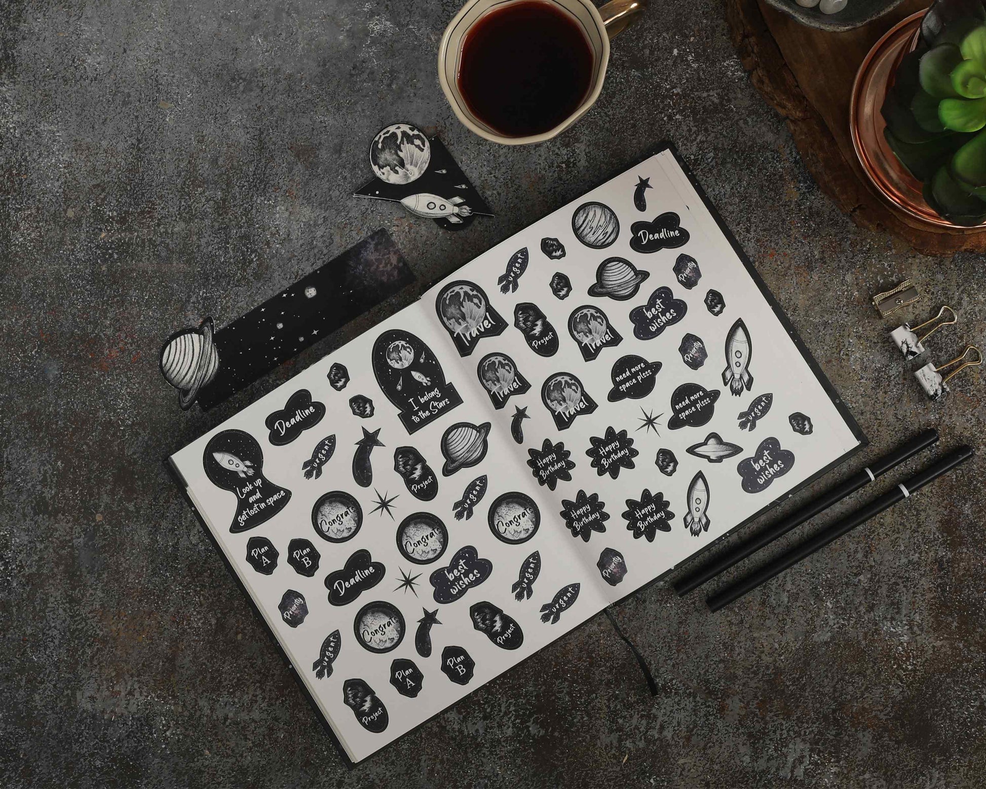Ps: our planner also includes 4 pages of stickers to make planning extra fun! Our Big Bang collection features art in charcoal and pen celebrating the cosmos in a grayscale palette.